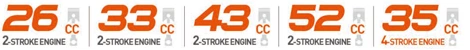 | Displacement | 25.4cc | 32.6cc | 42.7cc | 52cc | 35cc |